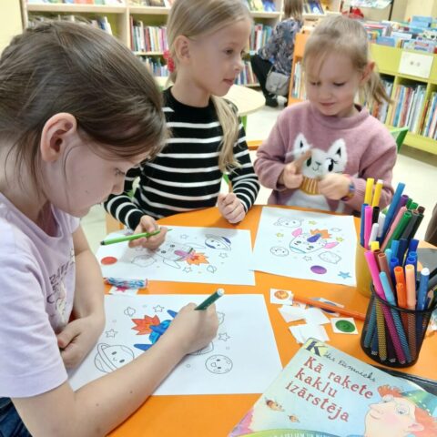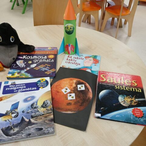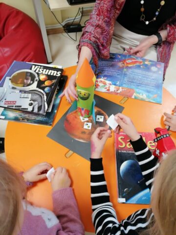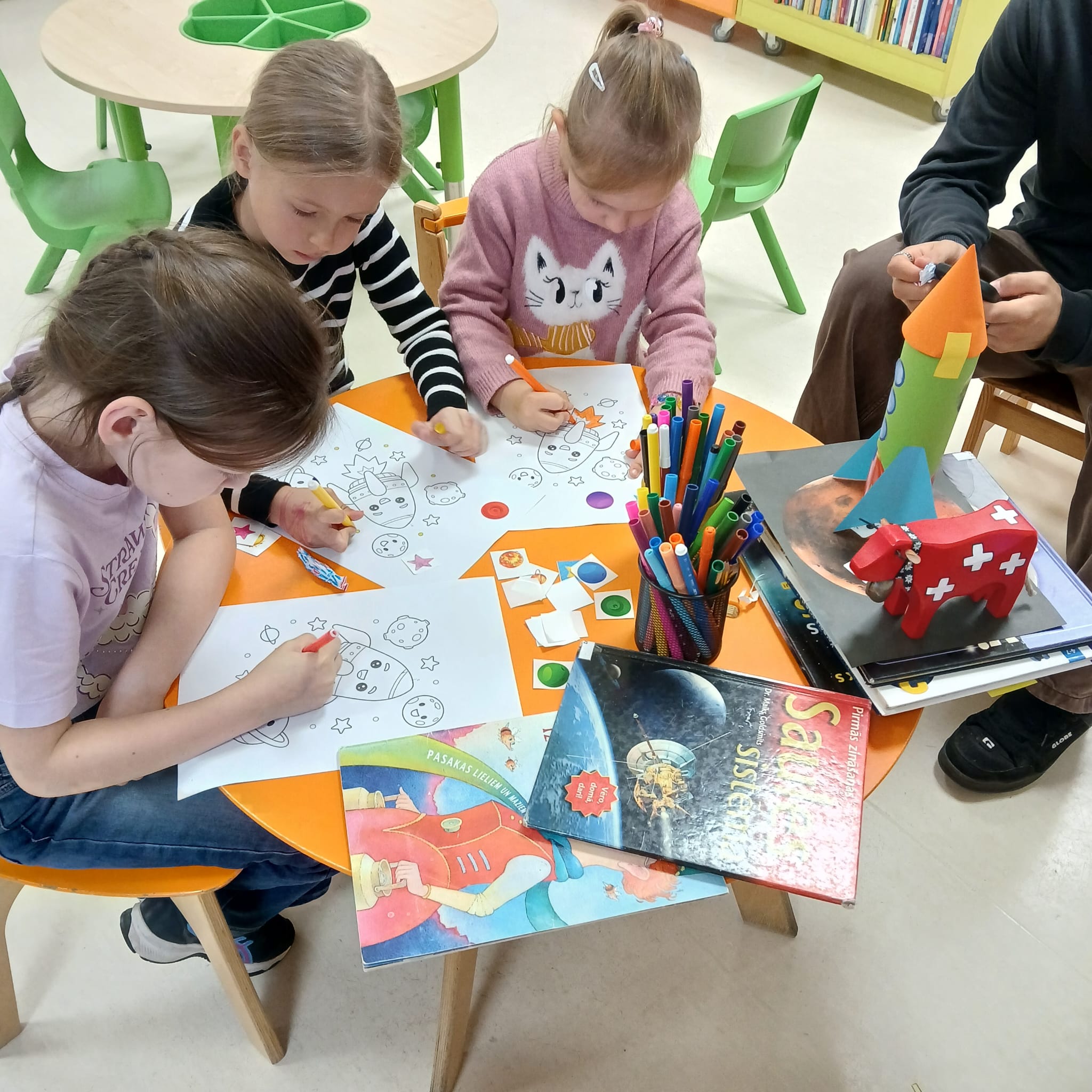 Bērni iepazina planētas, komētas un arī meteorus jeb “krītošās zvaigznes”, veica uzdevumus, krāsoja.