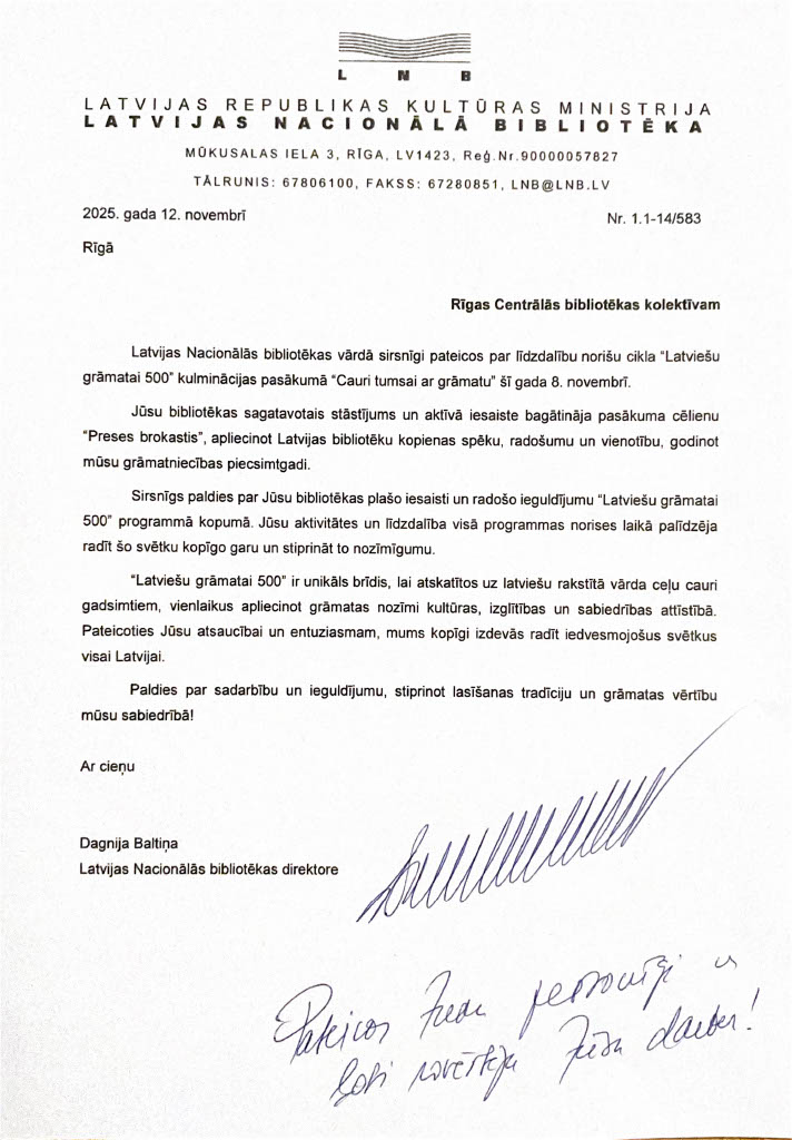 8.novembrī Rīgas Centrālā bibliotēka piedalījās norišu cikla “Latviešu grāmatai 500” kulminācijas pasākumā “Cauri tumsai ar grāmatu”, trīs minūšu tiešsaistes stāstījumā iepazīstinot ar izdevumu “Rīgas Centrālās bibliotēkas gadagrāmata”. Par to saņemta Latvijas Nacionālās bibliotēkas direktores Dagnijas Baltiņas pateicība.