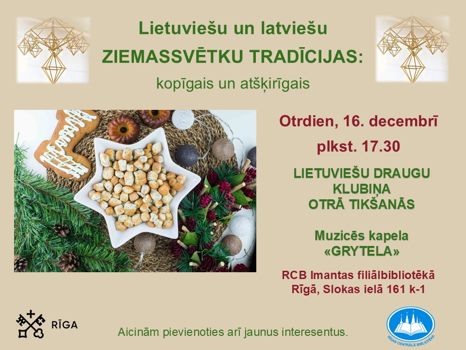 16.decembrī plkst.17.30 RCB Imantas filiālbibliotēkā (Slokas ielā 161 k-1) notiks Lietuviešu draugu klubiņa otrā tikšanās. Tajā pievērsīsimies kopīgajam un atšķirīgajam latviešu un lietuviešu Ziemassvētku tradīcijās.
