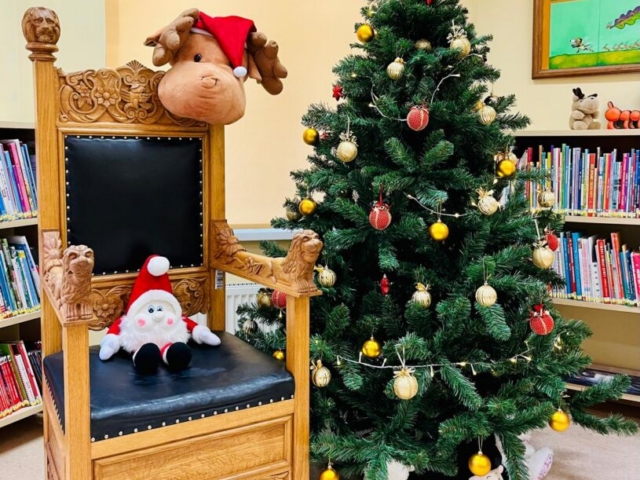 Iejusties ziemas noskaņās palīdz arī bibliotēkas krāšņā svētku egle un foto stūrītis, kas aicina uz skaistu fotosesiju.