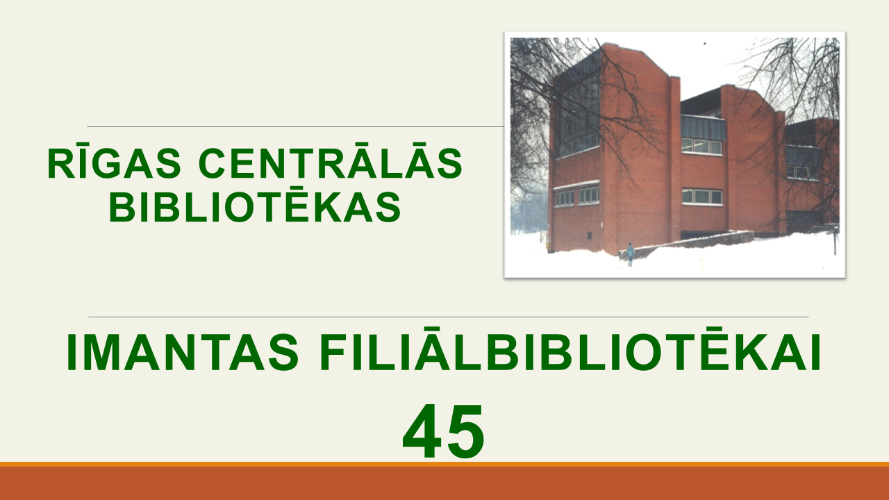 2025.gadā RCB Imantas filiālbibliotēka atzīmē 45 gadu jubileju. Virtuālā izstāde iepazīstina ar bibliotēkas darbiniekiem, pasākumiem, telpām, sadarbības partneriem – ar to, kas veido Imantas filiālbibliotēku jau 45 gadu garumā.