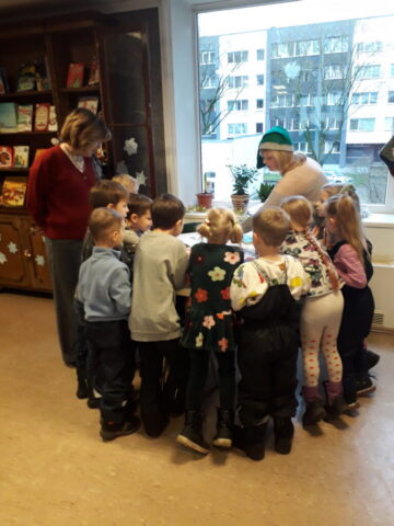 Lasījām arī grāmatu “Rūķi Rīgā” un gājām rotaļā “Rūķu zemei vārti vaļā”.