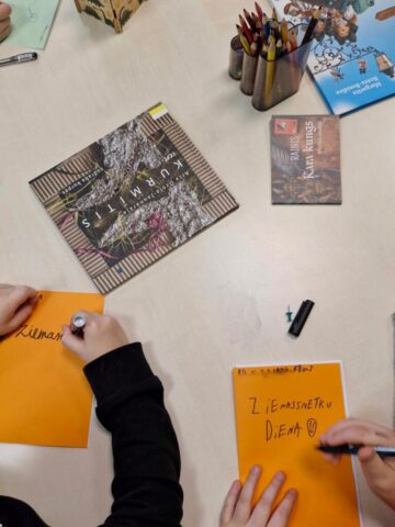 Decembrī sākumskolas audzēkņi kopā ar mākslinieci iepazinās ar izstādi “Ilustrācijas stāsts”, uzzinot arī to, kas jāņem vērā, lai radītu veiksmīgu grāmatas dizainu. Bērni uzsāka savu grāmatiņu veidošanu par Ziemassvētku tēmu un, protams, procesā radās arvien jauni jautājumi, līdz ar to lieliski noderēja Artas sniegtie padomi.