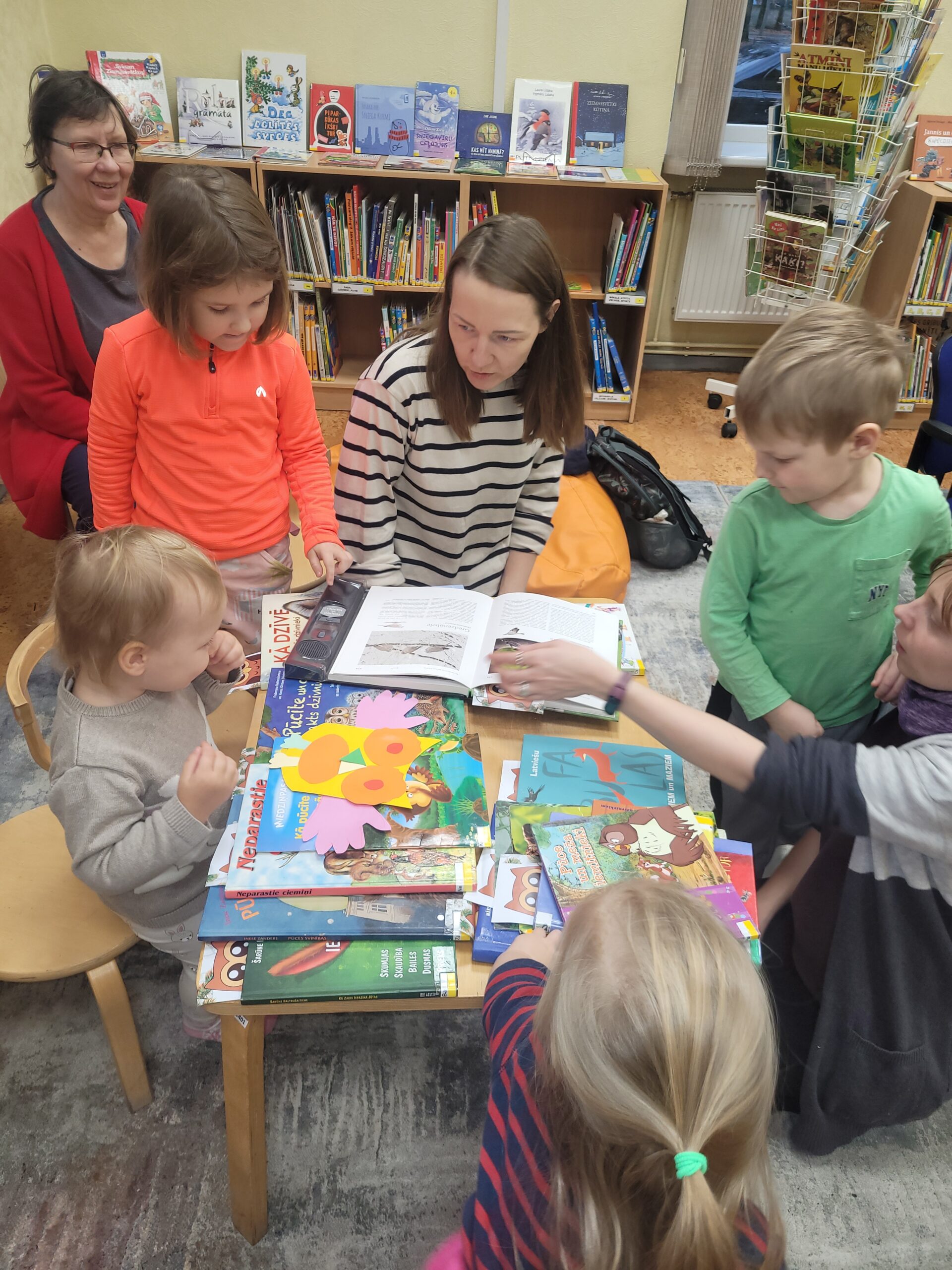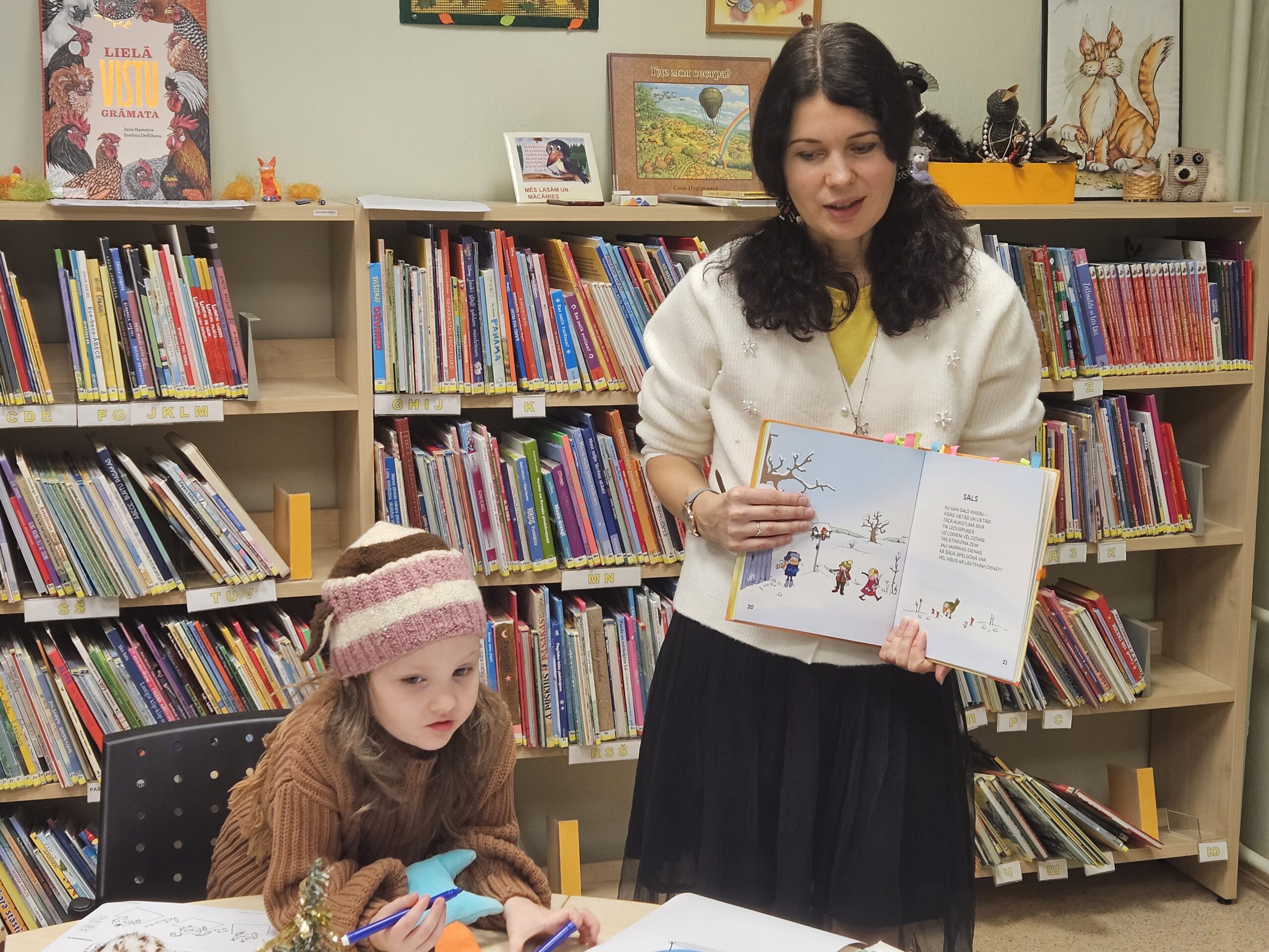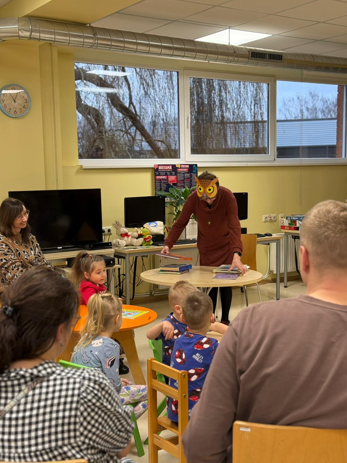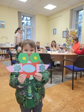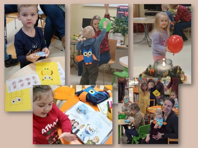 Grīziņkalna filiālbibliotēkā (Alauksta ielā 10) novembrī un decembrī Bibliotēkas Pūce bērnus sagaidīja divās “Pūčulēnu skolu” nodarbībās, kurās iepazīstināja ar bibliotēku un to, ka te mājo milzum daudz grāmatu par visdažādākajām tēmām, ka atšķirībā no grāmatnīcas bibliotēkā tūkstošiem grāmatu var dabūt par baltu velti – ir tikai jābūt vēlmei lasīt. Bērni mācījās, kādā secībā plauktos ir sakārtotas grāmatas un apguva burtiņu, ar ko sākas viņa vārdiņš. Izrādās, ka bibliotēkas plauktos mīt ne tikai grāmatas, bet mēdz slēpties arī konfektes. Bērniem tika lasīts fragments no Ineses Zanderes grāmatas “Vai grāmatai ir knābis?” un dota iespēja iepazīties ar pūčulēnu Elmāru un viņa draugiem, kas mīt grāmatas lappusēs. Aktivitāšu noslēgumā tika krāsotas “Vai grāmatai ir knābis?” krāsojamās lapas. Turpinājumā sekoja jautra dziesmiņa un kopīgi lasīti asprātīgi dzejolīši no Evijas Gulbes grāmatas “Dzejolēni”. Otrā “Pūčulēnu skolas” nodarbība bija Ziemassvētku noskaņās, to iesāka ar nelielu atskatu uz pūčulēna Elmāra piedzīvojumiem. Turpinājumā Bibliotēkas pūce lasīja priekšā fragmentus no Lauras Vinogradovas grāmatas “Ebes ziemas stāsti” un pārrunāja būtiskāko par Ziemassvētkiem, kā arī par draudzību. Neizpalika arī sportiska izkustēšanās mūzikas pavadījumā, kā arī jautras dziesmiņas dziedāšana. Radošajās aktivitātēs bērniem bija jādodas pie lielformāta lapas Ziemassvētku noskaņās un jākrāso savs izvēlētais attēls vai jāzīmē tas pašiem. Paldies visiem, kas piedalījās! Foto: RCB Grīziņkalna filiālbibliotēkas galvenā bibliotekāre Tatjana Kozika; Teksts: RCB filiālbibliotēkas “Strazds” galvenā bibliotekāre Daiga Gailīte.