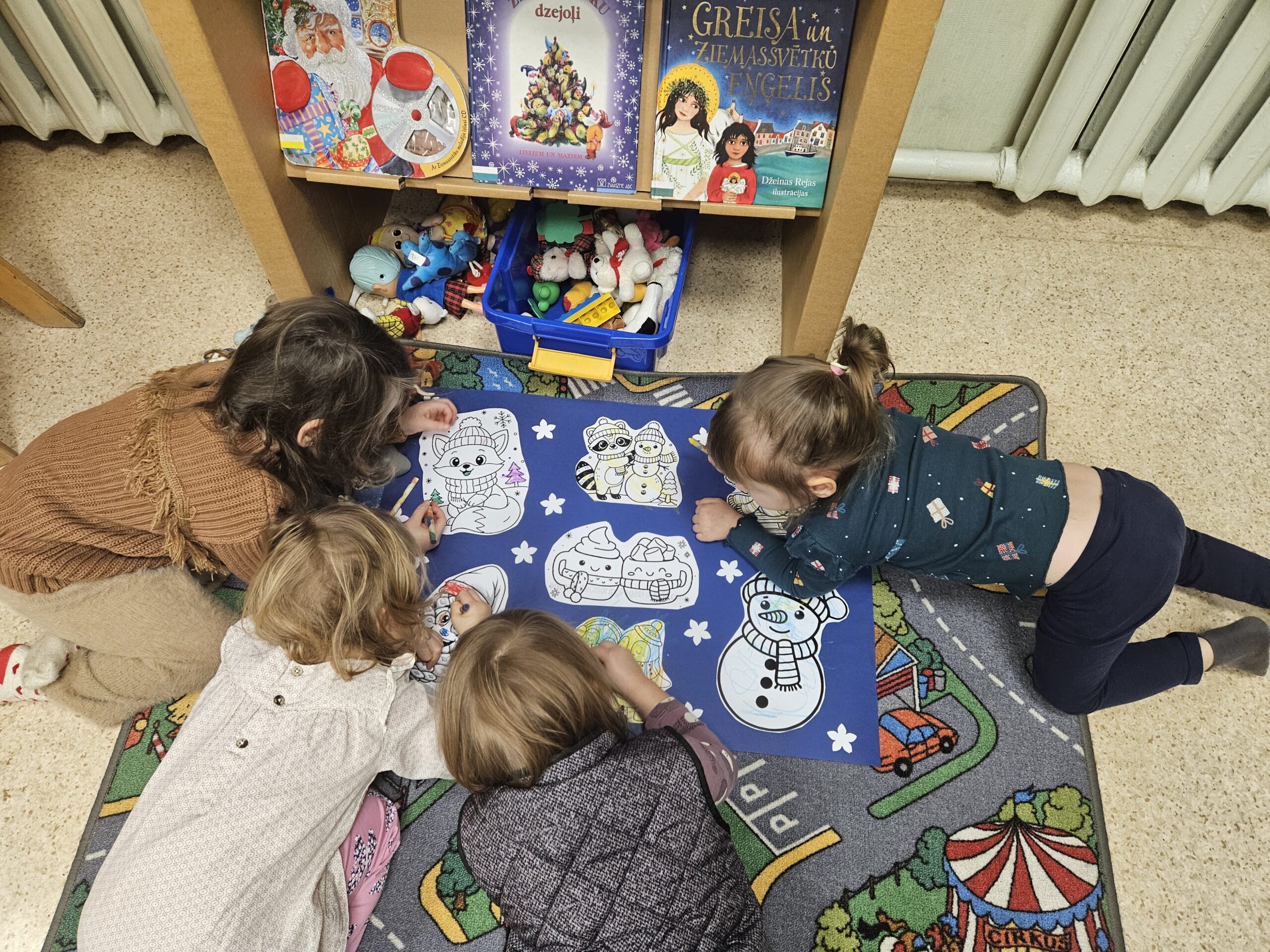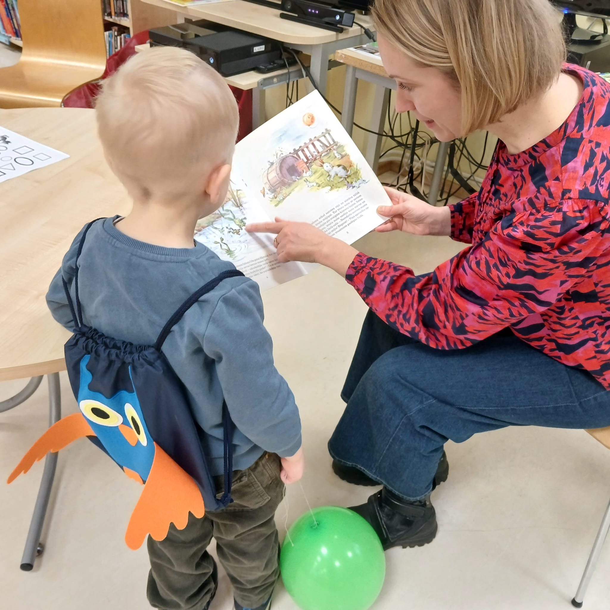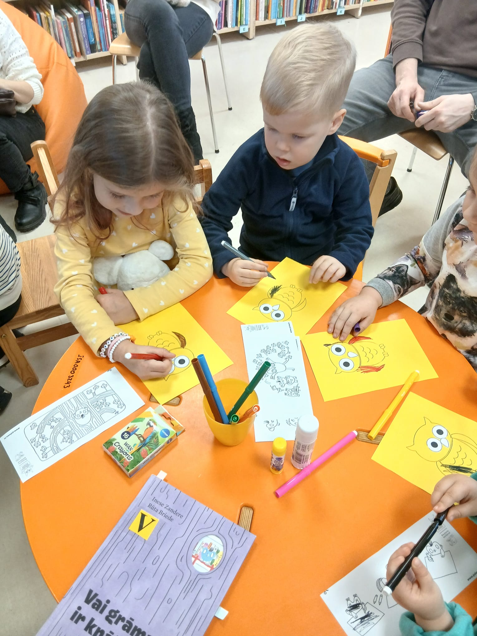 Grīziņkalna filiālbibliotēkā (Alauksta ielā 10) novembrī un decembrī Bibliotēkas Pūce bērnus sagaidīja divās “Pūčulēnu skolu” nodarbībās, kurās iepazīstināja ar bibliotēku un to, ka te mājo milzum daudz grāmatu par visdažādākajām tēmām, ka atšķirībā no grāmatnīcas bibliotēkā tūkstošiem grāmatu var dabūt par baltu velti – ir tikai jābūt vēlmei lasīt. Bērni mācījās, kādā secībā plauktos ir sakārtotas grāmatas un apguva burtiņu, ar ko sākas viņa vārdiņš. Izrādās, ka bibliotēkas plauktos mīt ne tikai grāmatas, bet mēdz slēpties arī konfektes. Bērniem tika lasīts fragments no Ineses Zanderes grāmatas “Vai grāmatai ir knābis?” un dota iespēja iepazīties ar pūčulēnu Elmāru un viņa draugiem, kas mīt grāmatas lappusēs. Aktivitāšu noslēgumā tika krāsotas “Vai grāmatai ir knābis?” krāsojamās lapas. Turpinājumā sekoja jautra dziesmiņa un kopīgi lasīti asprātīgi dzejolīši no Evijas Gulbes grāmatas “Dzejolēni”. Otrā “Pūčulēnu skolas” nodarbība bija Ziemassvētku noskaņās, to iesāka ar nelielu atskatu uz pūčulēna Elmāra piedzīvojumiem. Turpinājumā Bibliotēkas pūce lasīja priekšā fragmentus no Lauras Vinogradovas grāmatas “Ebes ziemas stāsti” un pārrunāja būtiskāko par Ziemassvētkiem, kā arī par draudzību. Neizpalika arī sportiska izkustēšanās mūzikas pavadījumā, kā arī jautras dziesmiņas dziedāšana. Radošajās aktivitātēs bērniem bija jādodas pie lielformāta lapas Ziemassvētku noskaņās un jākrāso savs izvēlētais attēls vai jāzīmē tas pašiem. Paldies visiem, kas piedalījās! Foto: RCB Grīziņkalna filiālbibliotēkas galvenā bibliotekāre Tatjana Kozika; Teksts: RCB filiālbibliotēkas “Strazds” galvenā bibliotekāre Daiga Gailīte.