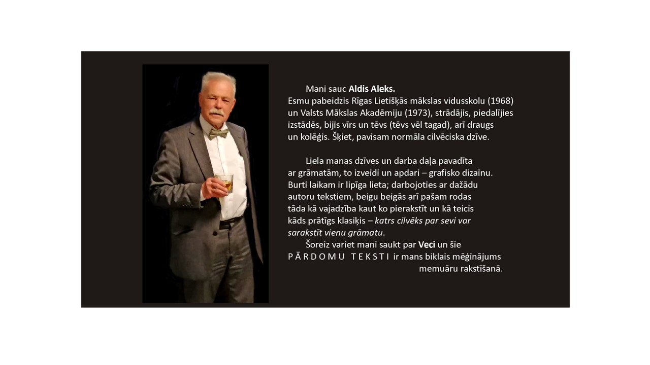 Mākslinieks Aldis Aleksis par sevi: “Liela mana dzīves un darba daļa pavadīta ar grāmatām, to izveidi un apdari – grafisko dizainu. Burti laikam ir lipīga lieta, darbojoties ar dažādu autoru tekstiem, beigu beigās arī pašam rodas tāda kā vajadzība kaut ko pierakstīt un, kā teicis kāds prātīgs klasiķis, – katrs cilvēks par sevi var sarakstīt vienu grāmatu. Šoreiz varat mani saukt par Veci un šie PĀRDOMU TEKSTI ir mans biklais mēģinājums memuāru rakstīšanā.”
