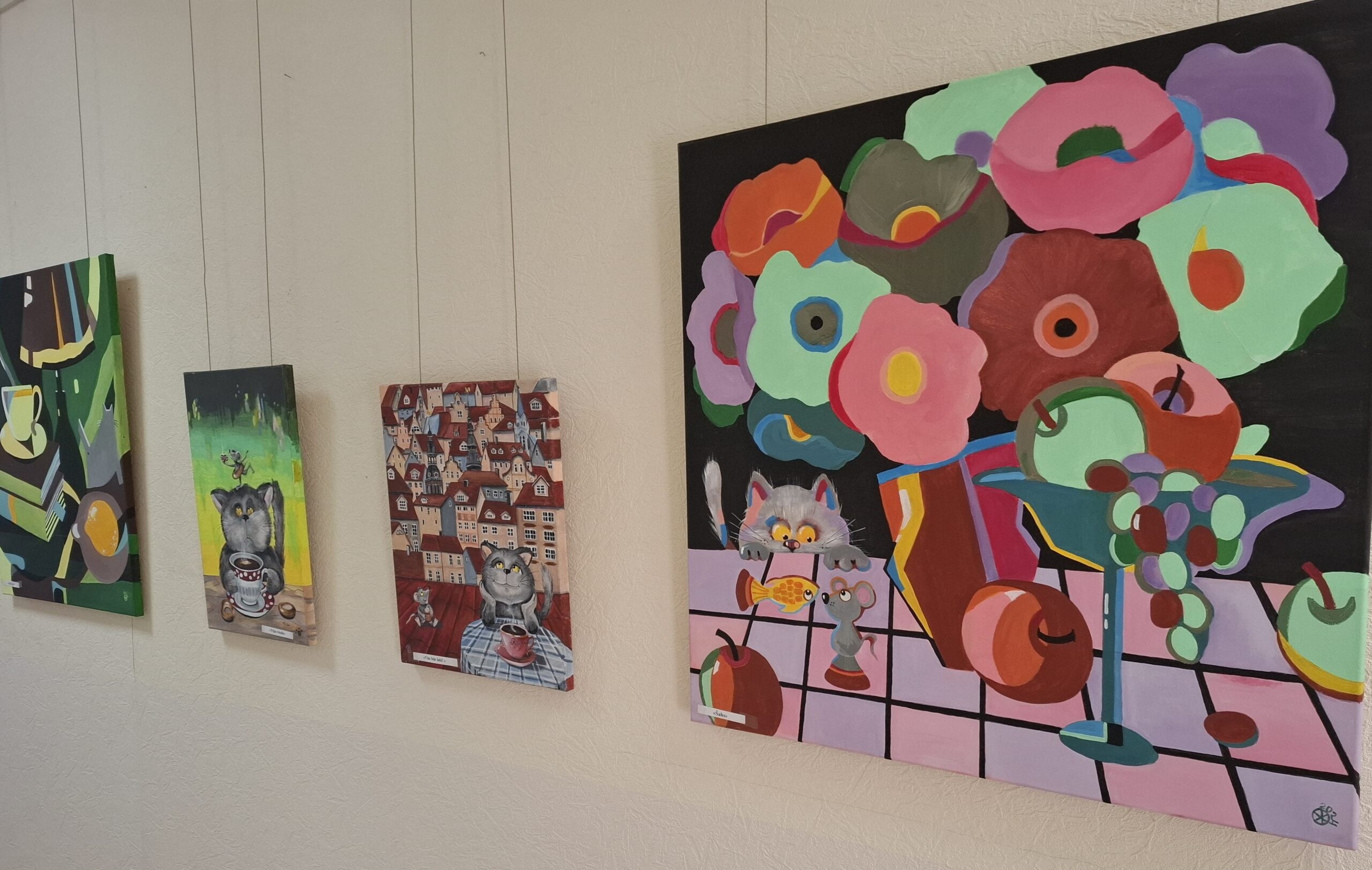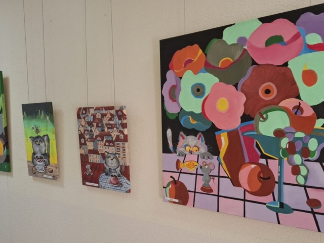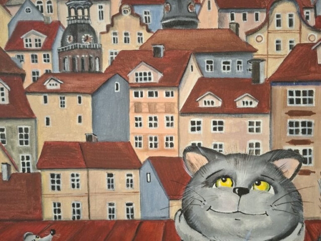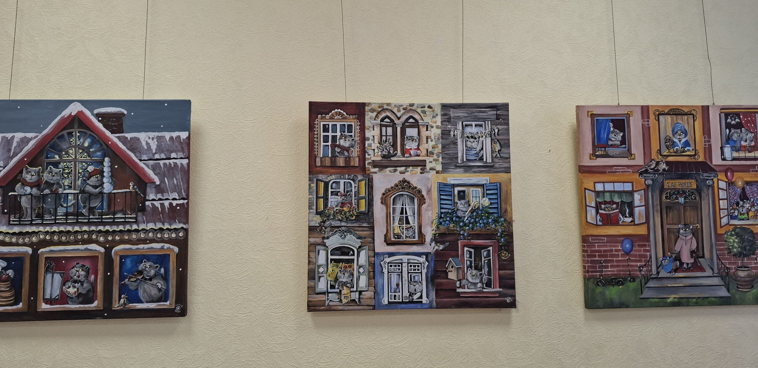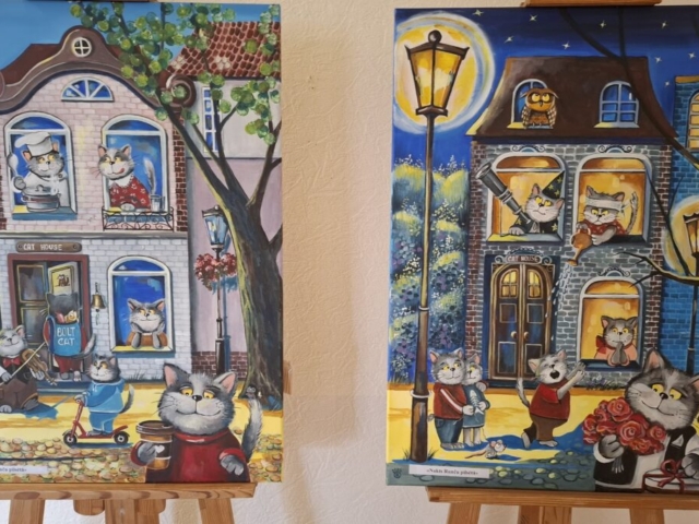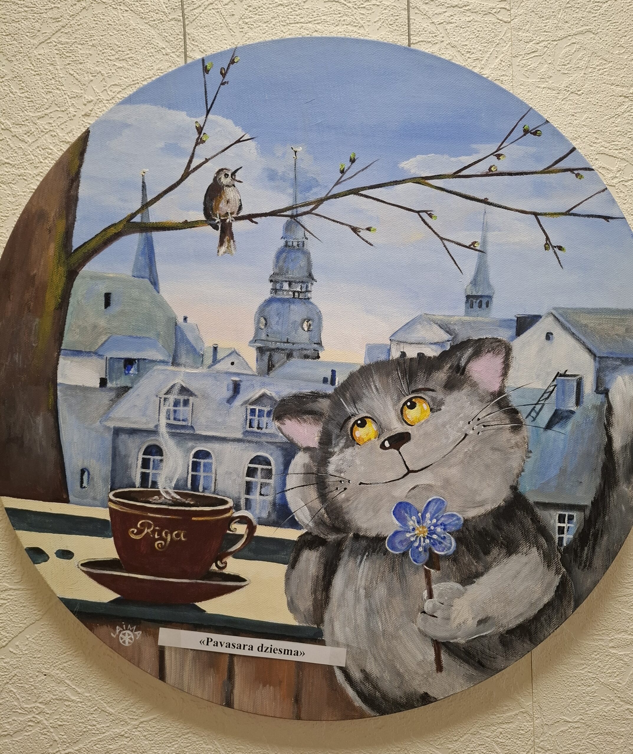 Ne velti izstāde saucas “Kaķis visu gadu“, jo katrā gleznā redzami kaķi: priecīgi un domīgi, draiski un sapņotāji.