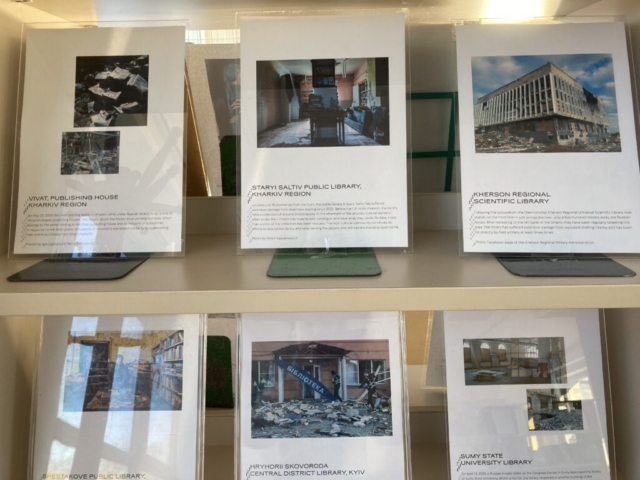 Fotogrāfijās redzamas iznīcinātas, sadegušas vai izlaupītas bibliotēkas visā Ukrainā – no frontes ciemiem līdz lielpilsētām. Šie attēli ne tikai dokumentē fiziskos postījumus, bet arī mēģinājumu iznīcināt kultūras atmiņu, valodu, zināšanas un ukraiņu pašidentitāti.