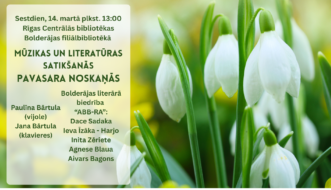 Aicinām ikvienu uz literāri muzikālu pasākumu “Pavasara noskaņās”. Pasākumā piedalīsies mūzikas pedagoģe un pianiste Jana Bārtula, vijoles klases audzēkne Paulīna Bārtula un Bolderājas literārās biedrības “ABB-RA” literāti Dace Sadaka, Ieva Īzāka-Harjo, Inita Zēriete, Agnese Blaua un Aivars Bagons.